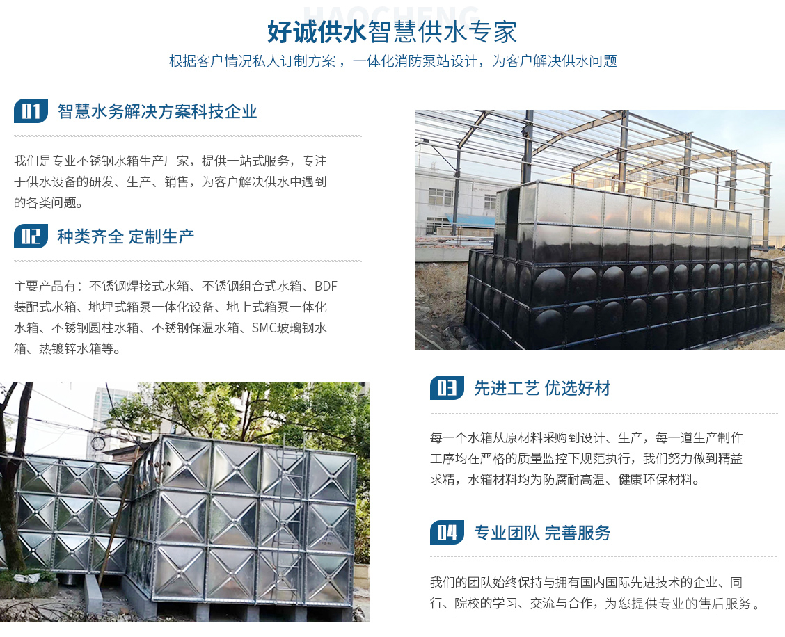 安徽好誠供水設(shè)備制造有限公司是一家集設(shè)計(jì)、研發(fā)、制造、銷售、售后為一體的專業(yè)不銹鋼水箱生產(chǎn)廠家,以科技力量立足于社會(huì)。近幾年來致力于供水設(shè)備、水箱的研究與開發(fā)。主要產(chǎn)品有:不銹鋼焊接式水箱、不銹鋼組合式水箱、BDF裝配式水箱、地埋式箱泵一體化設(shè)備、地上式箱泵一體化水箱、不銹鋼圓柱水箱、不銹鋼保溫水箱、SMC玻璃鋼水箱、熱鍍鋅水箱。對(duì)于傳統(tǒng)混凝土水箱的改造(即不銹鋼內(nèi)貼水箱),老舊水箱的拆除、更換、...
